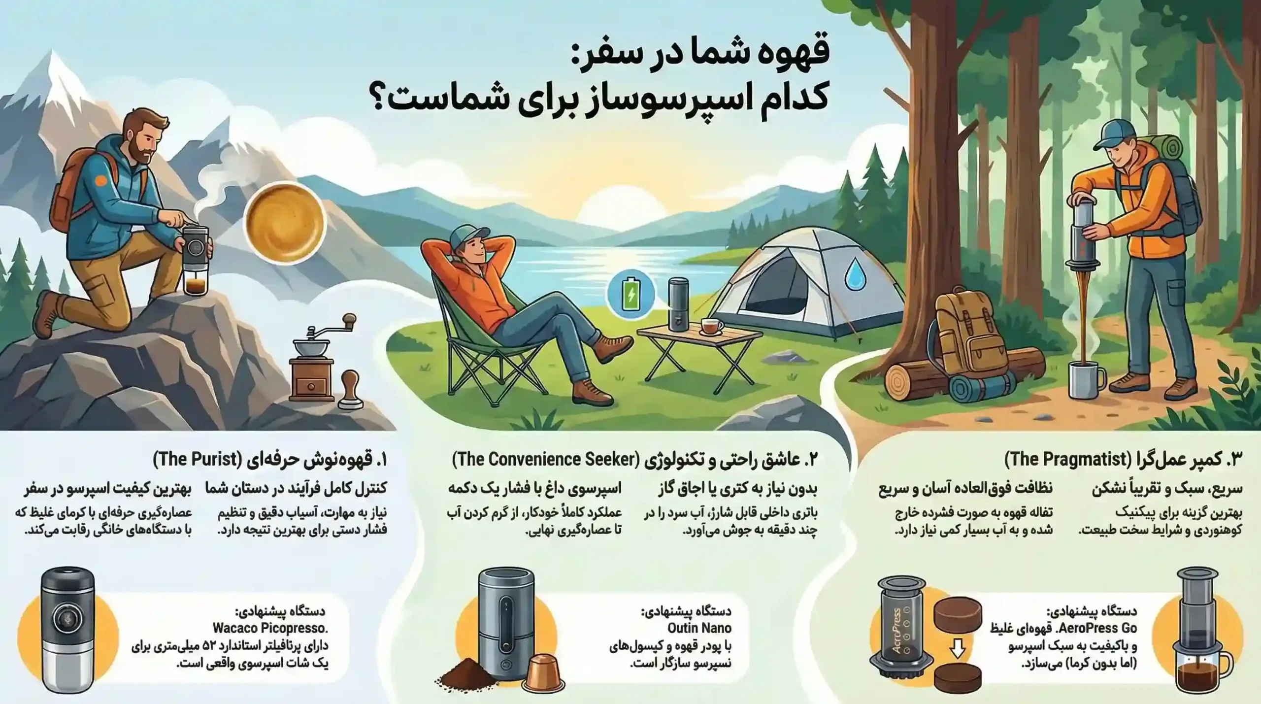 اسپرسوساز مسافرتی نوعی دستگاه قهوهساز است که با ابعاد کوچک و قابلیت حمل آسان، امکان تهیه اسپرسو را در شرایطی فراهم میکند که دستگاههای معمولی قابل استفاده نیستند. این دستگاهها بسته به نوع مدل میتوانند با برق مستقیم، باتری یا فشار دستی کار کنند و حتی در طبیعتگردی و کمپینگ نیز قابل استفاده هستند.
