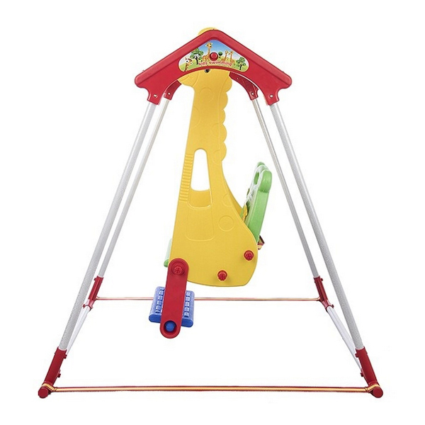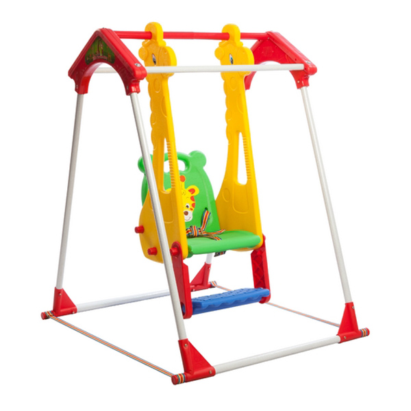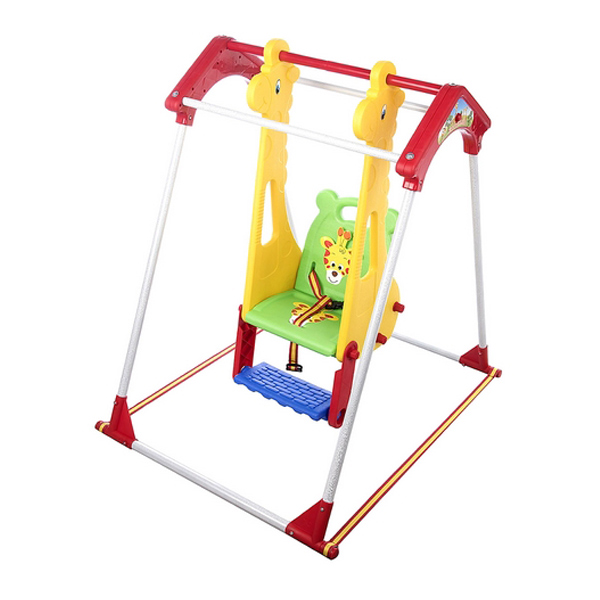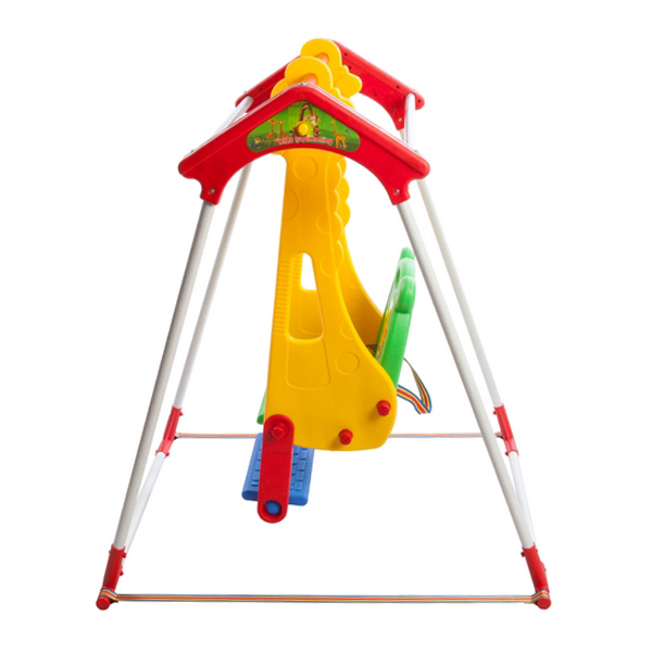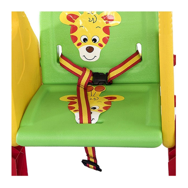 • ایمنی بالا: نشیمنگاه دارای پشتی پلاستیکی و کمربند ایمنی است که از افتادن کودک جلوگیری می‌کند. همچنین، تسمه‌های ثابت‌کننده پایه‌های فلزی، ثبات و امنیت تاب را افزایش می‌دهند.