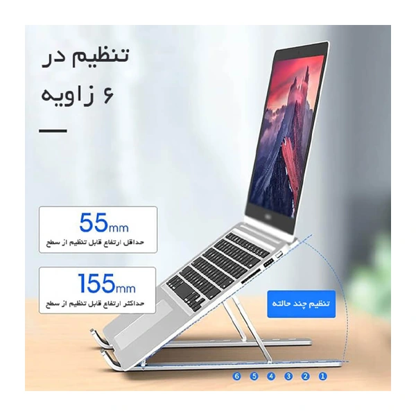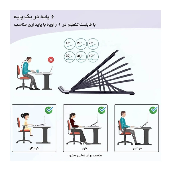 - قابلیت تنظیم ارتفاع و زاویه لپتاپ در موقعیتهای متفاوت بسته به نیاز کاربر